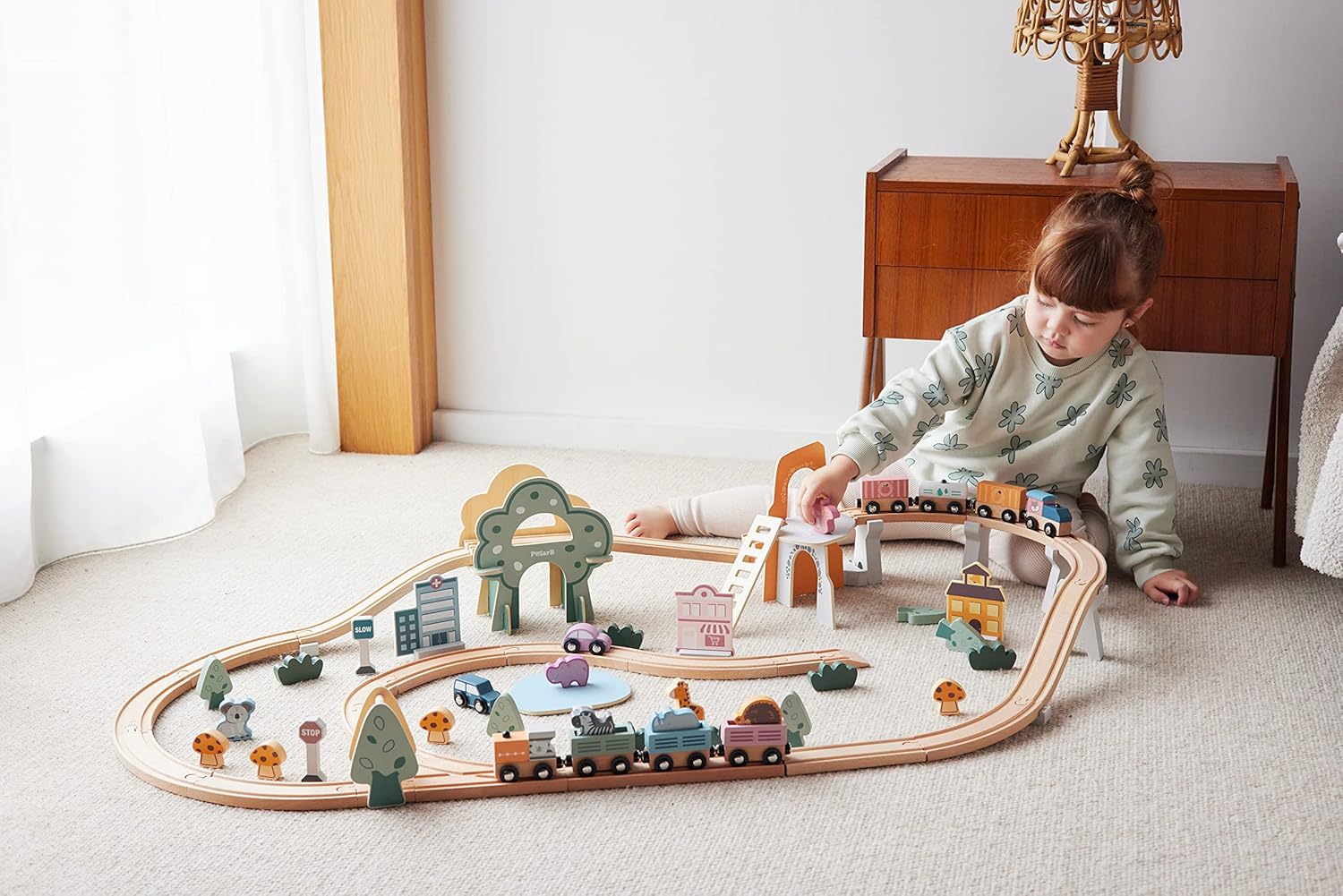 - تتكون مجموعة القطار هذه التي يبلغ عددها 90 قطعة ليس فقط من قطار ركاب حديث ولكن أيضًا قطار شحن جميل والعديد من الكتل الزراعية التي تتكون من منزل وحيوانات مزرعة ومزارع والعديد من الأشجار والشجيرات بالإضافة إلى العديد من كتل المدينة من محطة الإطفاء ومركز الشرطة ، ومدرسة ، ومحل بقالة ، ورجل إطفاء ، ورجل شرطة ، وسيارة إطفاء ، وسيارة شرطة ، وحافلة مدرسية ، وبعض إشارات المرور. القضبان مصنوعة من خشب الزان عالي الجودة.