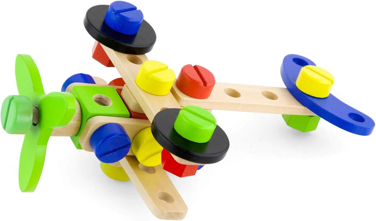 Wooden pieces that can be inter-linked together to form different models like helicopters, racing cars, and so on. Comes with a booklet as a reference guide.