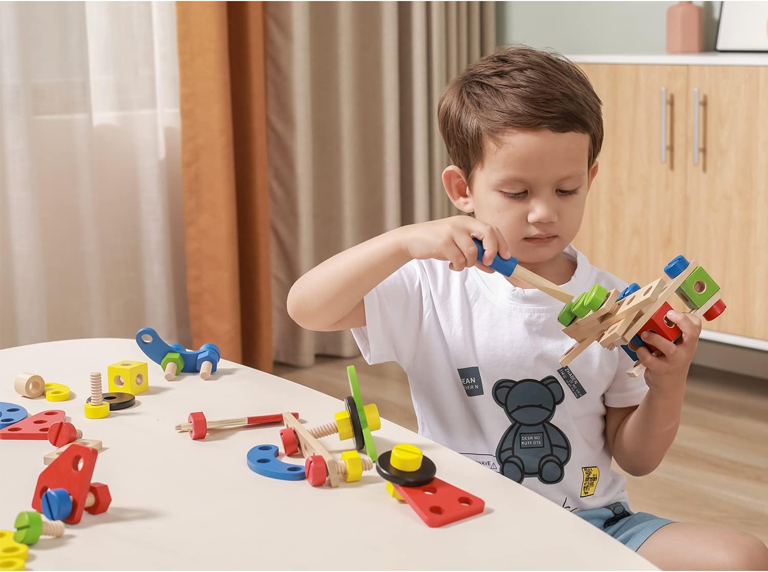 Wooden pieces that can be inter-linked together to form different models like helicopters, racing cars, and so on. Comes with a booklet as a reference guide.