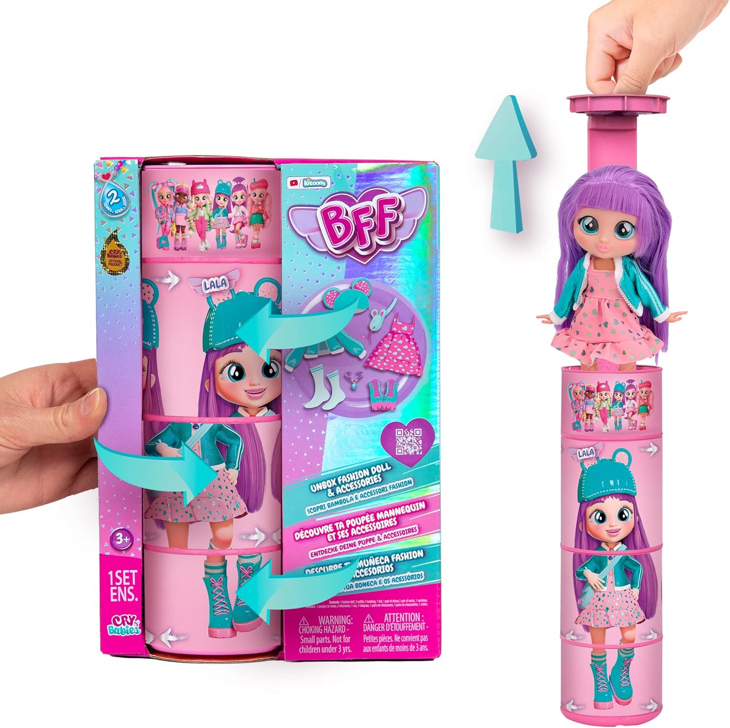 - Turn the blocks on the packaging to change the look of the doll.