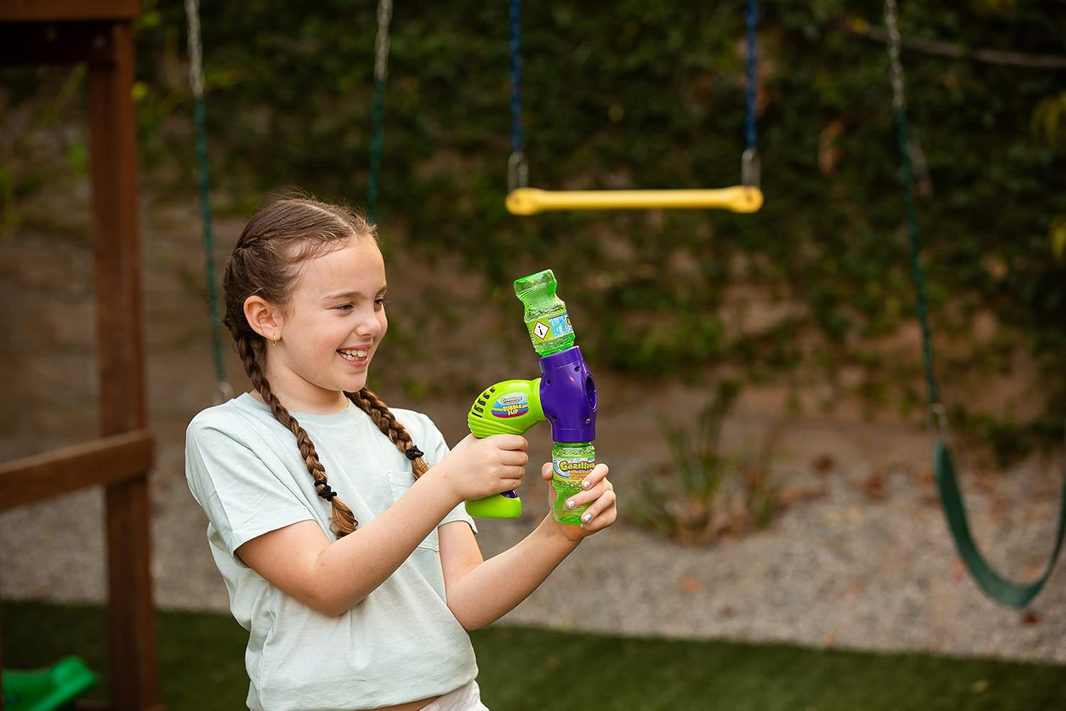 Introducing Gazillion Bubbles® Bubble Flip for a non-stop stream of bubble fun! With the flip action design the bubble fun never ends! Load by twisting the 4oz. Solution bottle into the bubble blaster, once full press the trigger to begin blowing a stream of bubbles. Once the bottle is empty, flip the front part of the blaster, use the bottle as a handle and press the trigger again for more bubble action! Each Bubble Flip includes one 4oz. bottle of Gazillion Bubbles Solution. Appropriate for ages 3 years and up.