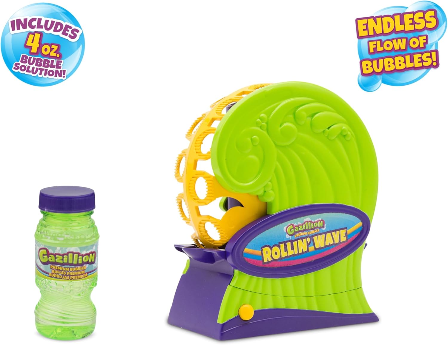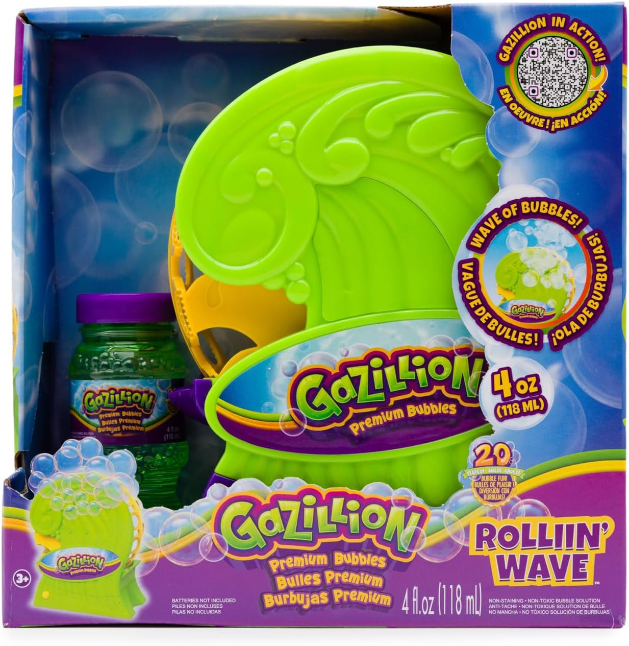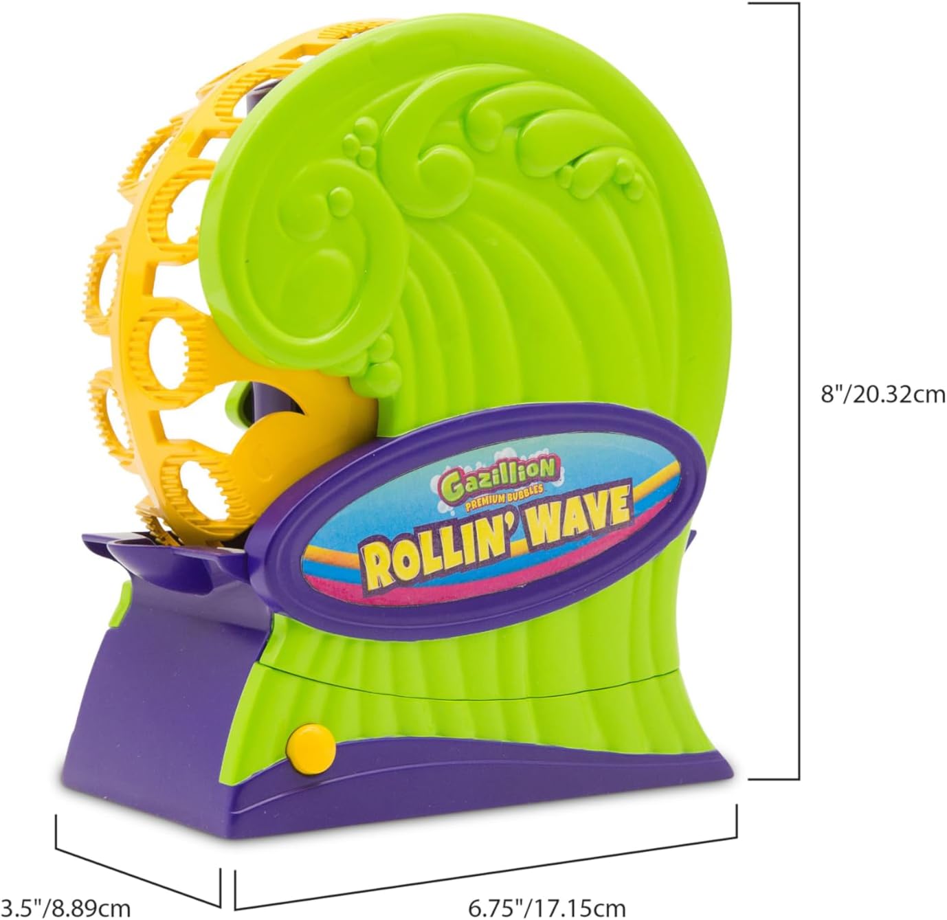 Instantly create a wave of bubbles with Gazillion Bubbles® Rollin’ Wave! With the press of a button this innovative design unleashes an endless flow of bubbles! Simply pour the Gazillion Bubbles solution into the bottom tray, press the “on” button and watch the bubble fun begin. Each Rollin’ Wave includes one 4oz. bottle of premium Gazillion Bubbles Solution. Appropriate for ages 3 years and up.