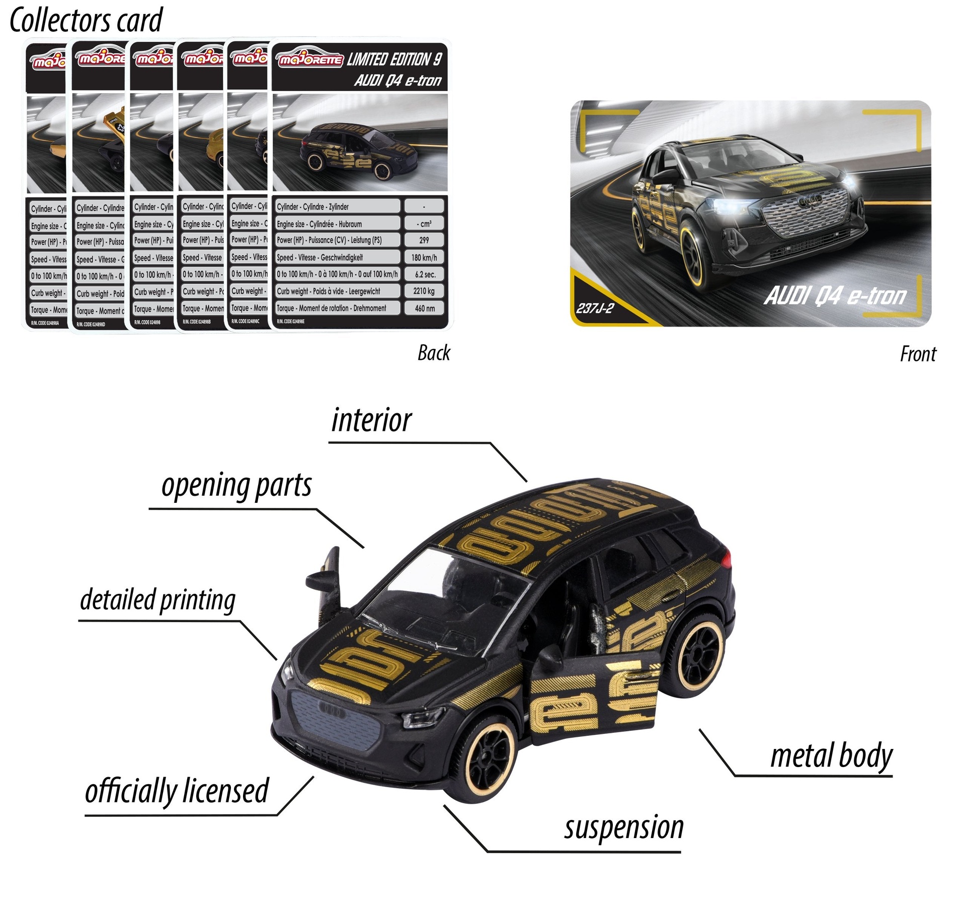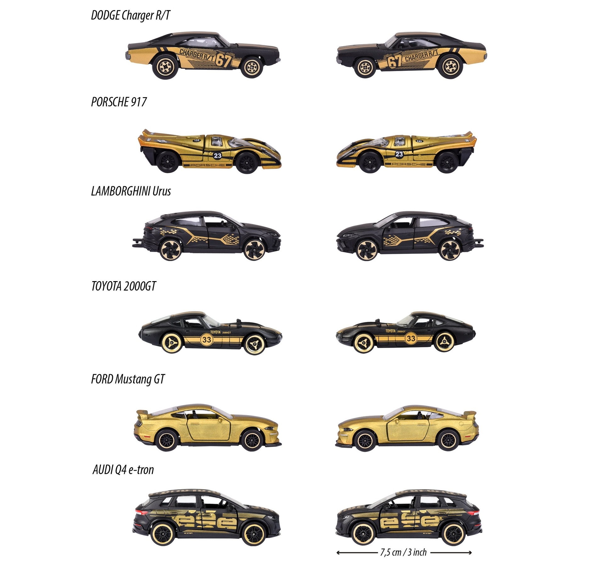 • Package contents SRed at random: Audi Q4 e-tron, Dodge Charger R/T, Ford Mustang GT, Lamborghini Urus, Porsche 917, or Toyota 2000GT in exclusive gold design.The Limited Edition 9 from Majorette is the ideal gift for fans and collectors of model vehicles.The unique black and gold design gives the toy cars a chic, high-end look – a real eye-catcher!You will receive one of six randomly assorted racing vehicles in 1:64 scale (Audi Q4 e-tron, Dodge Charger R/T, Ford Mustang GT, Lamborghini Urus, Porsche 917, Toyota 2000GT).In addition to their stunning black and gold design, the vehicles are packed with fun features such as rotating wheels and opening parts that help to train fine motor skills and stimulate your child’s curiosity.Each vehicle also comes with a matching collector’s card, which shows an image of the vehicle in action and lists the key performance stats. A must-have for collectors!Majorette specializes in realistic models of vehicles, all of which have official licenses from the automotive industry as well as a metal chassis to ensure a long lifespan.