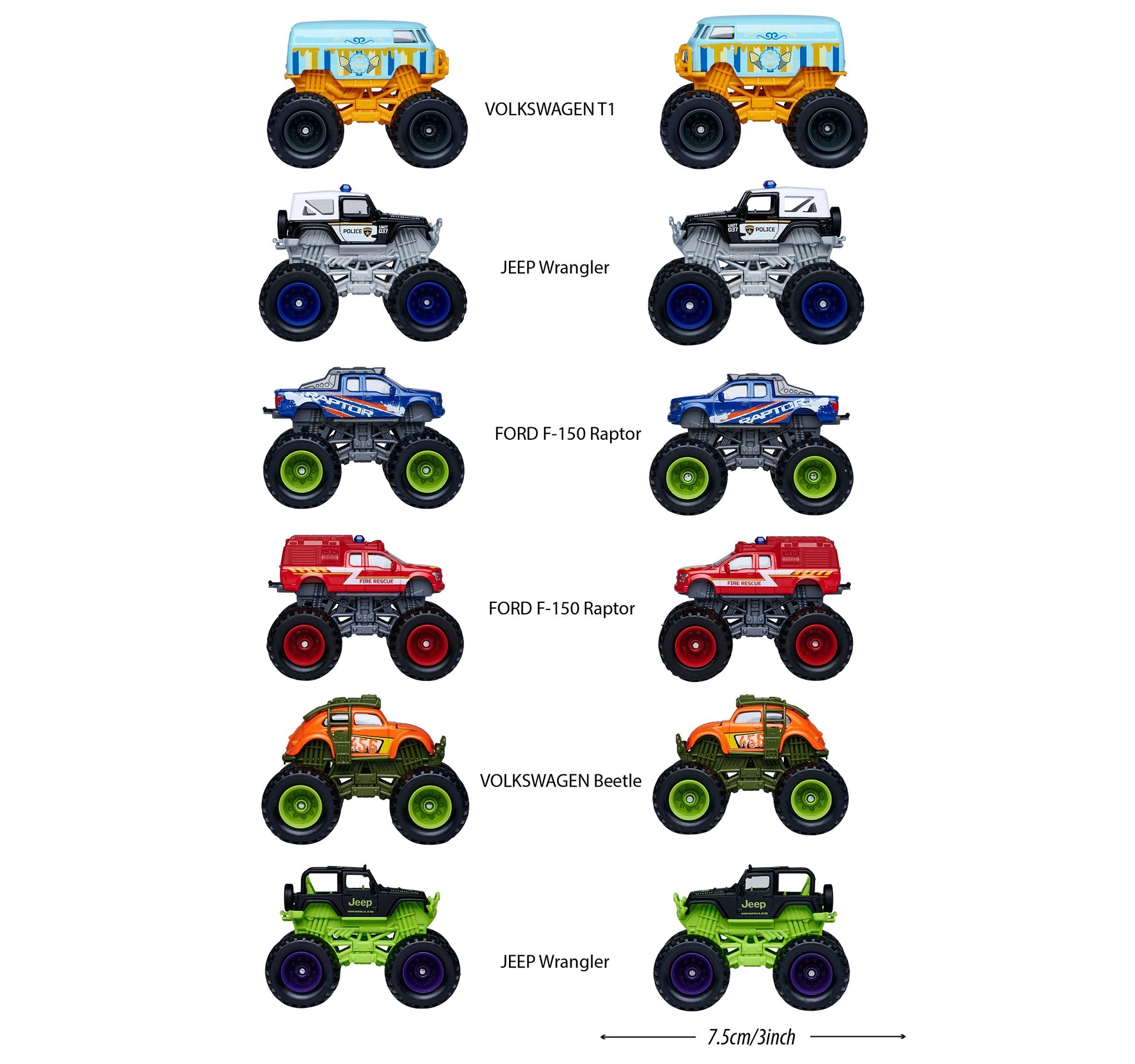 suspension and steering. The five die-cast toy cars with free-wheel are a homage to the gigantically overblown monster trucks that delight motor fans all over the world. Whoever adds these to his collection of toy cars will be sure of having a real highlight in the fleet. And whoever said that the monster Bus would not be discovered somewhere in full size?