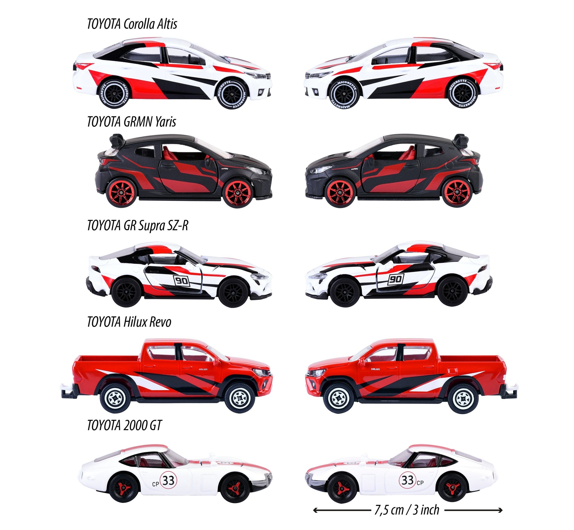 • 5 Gift Set – The Majorette toy car set contains 5 different Toyota models: 1. Toyota 2000 GT, 2. Toyota Hilux Revo, 3. Toyota GR Supra SZ-R, 4. Toyota Corolla Altis, 5. Toyota GRMN Yaris.