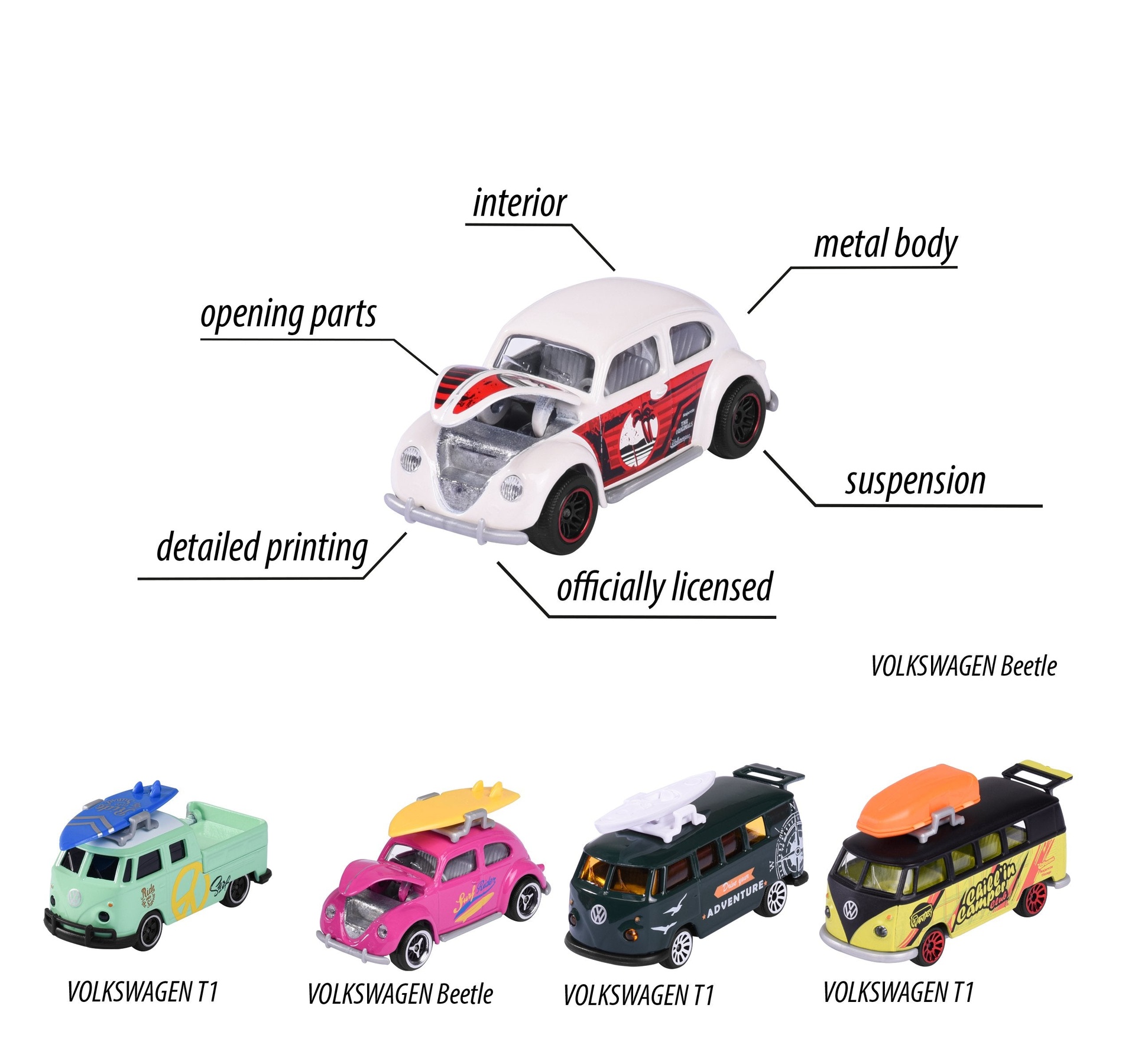 • 2 exclusive models – In addition to the Volkswagen Beetle and two different Volkswagen T1 models, the vehicle set also includes two exclusive models – the Volkswagen Beetle in white and the Volkswagen T1 in black-yellow.