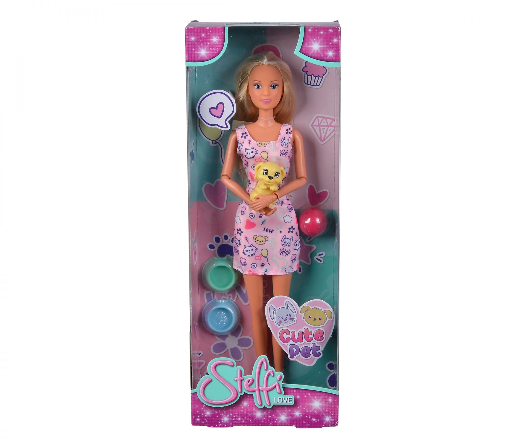 She loves elegant clothes, trendy hairstyles. – Steffi cares for her little pet, plays with a ball and gives it something to eat. – The measure: 29cm. – Recommended Age: Suitable for 3 years and above.