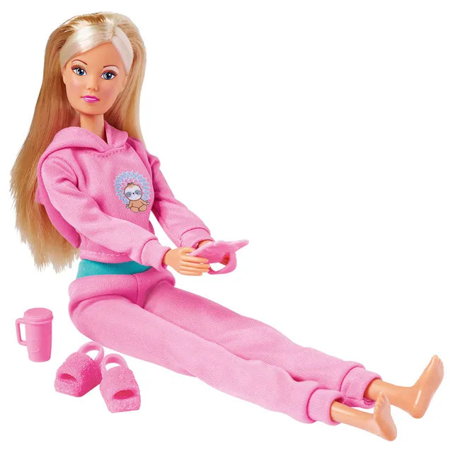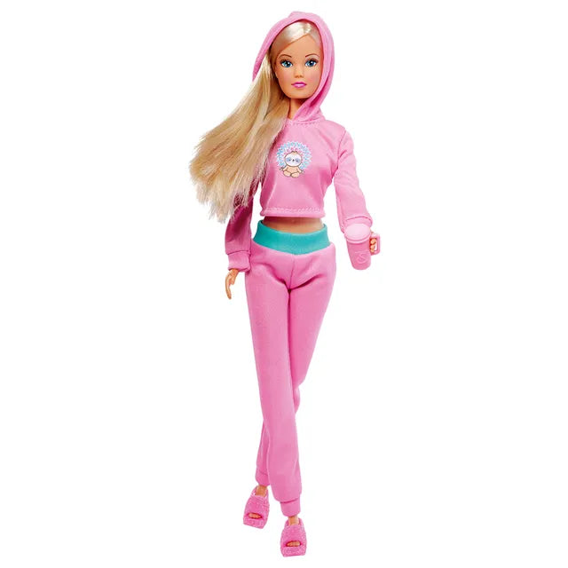 Dress-up doll Steffi LOVE is a real fashion doll. She loves chic clothes, trendy hairstyles, her little sister Evi and of course her boyfriend Kevin. Girls can style and dress their doll in the current fashion trends. , , Steffi in home wear – For once, Steffi hasn’t planned to do anything and has put on her best jogging suit to defy the rainy weather on the couch. Cosy outfit – Steffi’s fashionable two-piece suit consists of cuddly pink pants with a turquoise waistband and a matching hooded sweater with a cute sloth motif. Slippers complete your outfit. , , Set Contents – In addition to the 29cm tall Steffi doll, the set also includes a stylish drinks mug, a tablet and a matching pair of pink slippers.