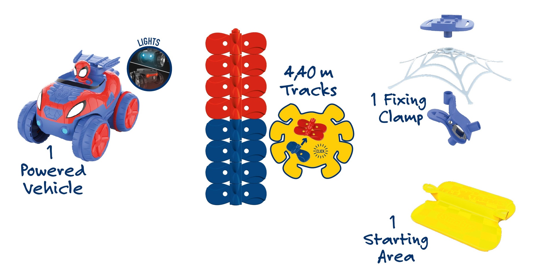 - The set includes 4,4m of tracks (184pcs), 1 electronic Spidey vehicle with lights, and 1 fixing web with clamp. Batteries included.