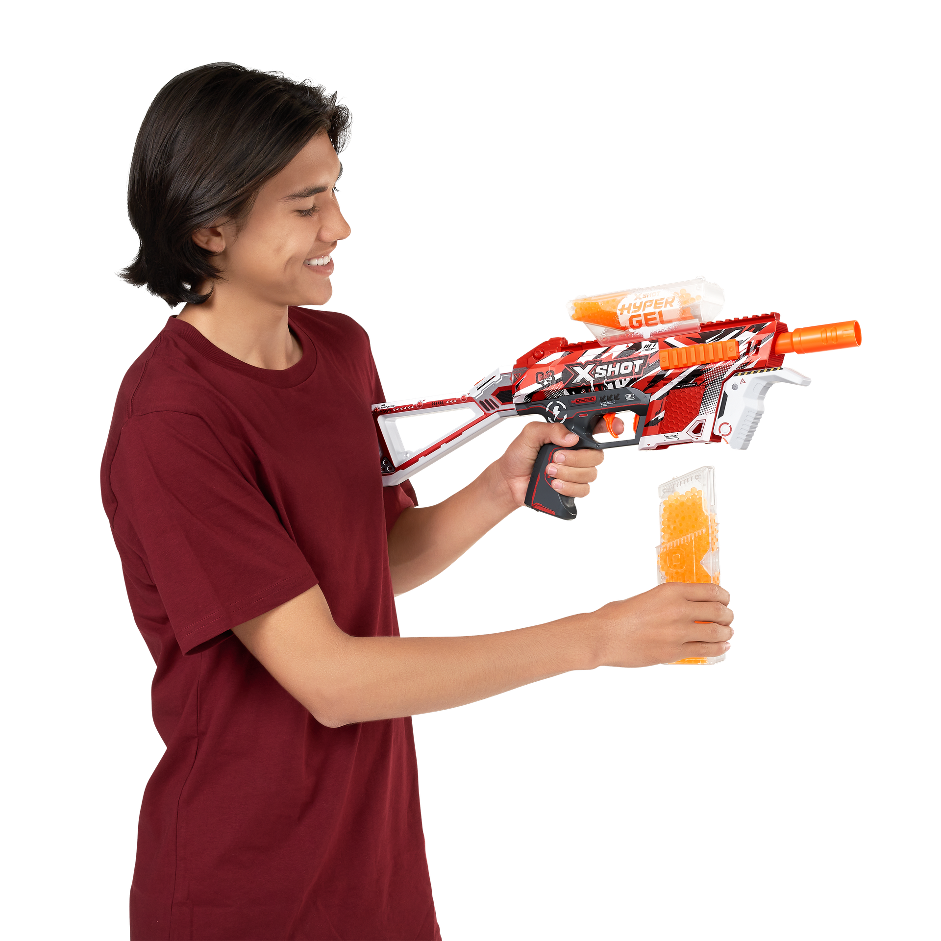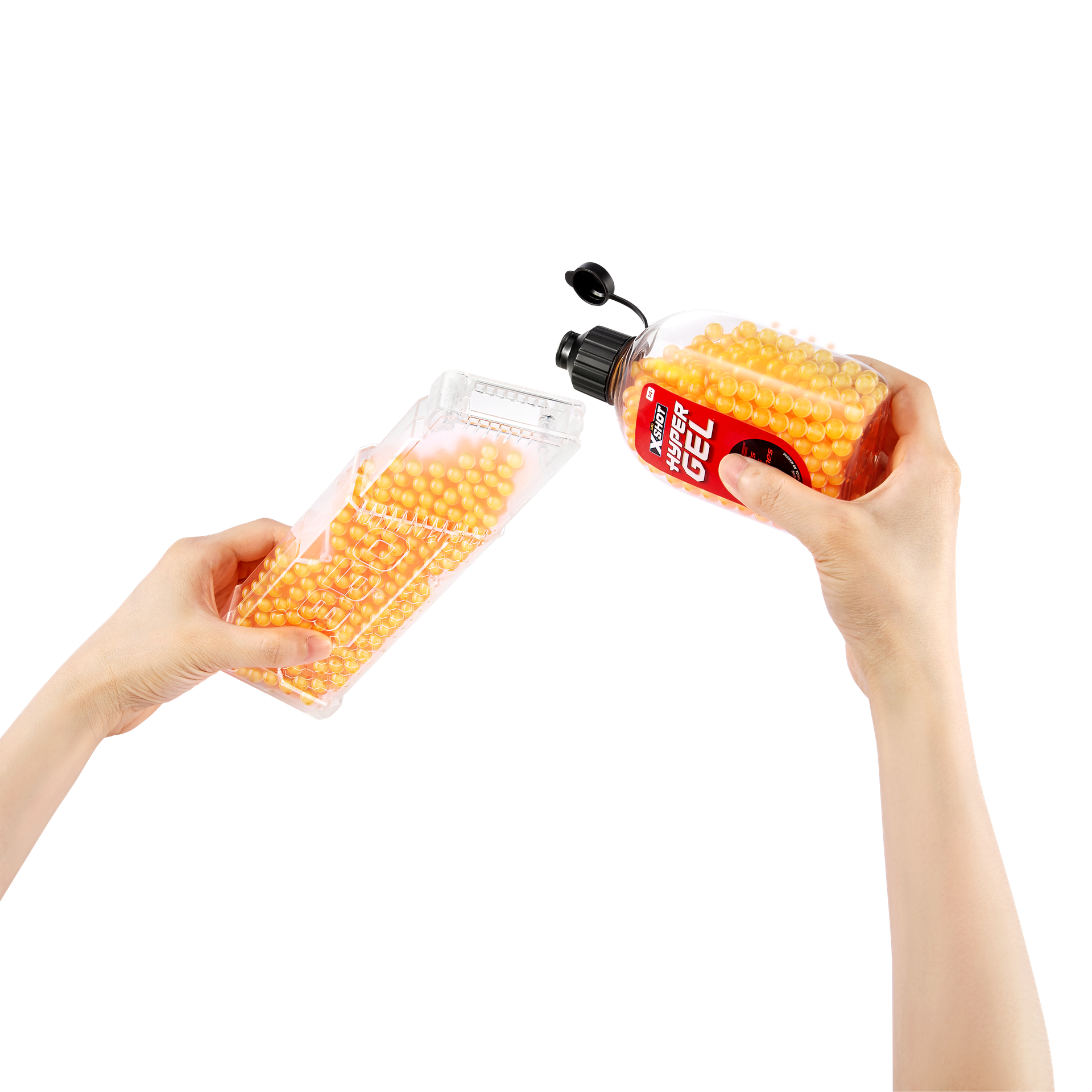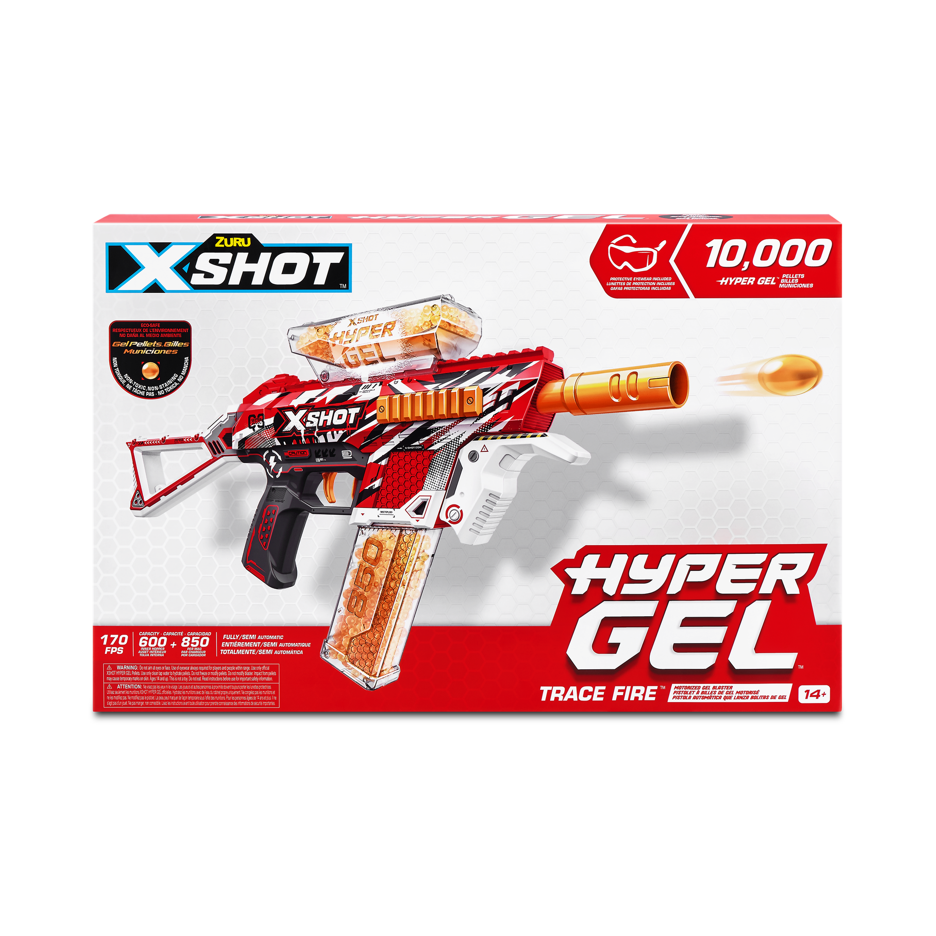 It’s time to get hyped up with X-Shot Hyper Gel! The X-Shot Hyper Gel Trace Fire can blast Hyper Gel Pellets at 200 feet per second with its motorized fully and semi automatic modes. The Trace Fire has a 800 Pellet capacity hopper, when you run out of Gel Pellets simply flip your blaster to reload from the 800 Pellet capacity mag. This motorized Gel Blaster comes with a rechargeable battery. Stocked with 10,000 Hyper Gel Pellets and protective eyewear, just add water to start the ultimate Gel Blaster battle!